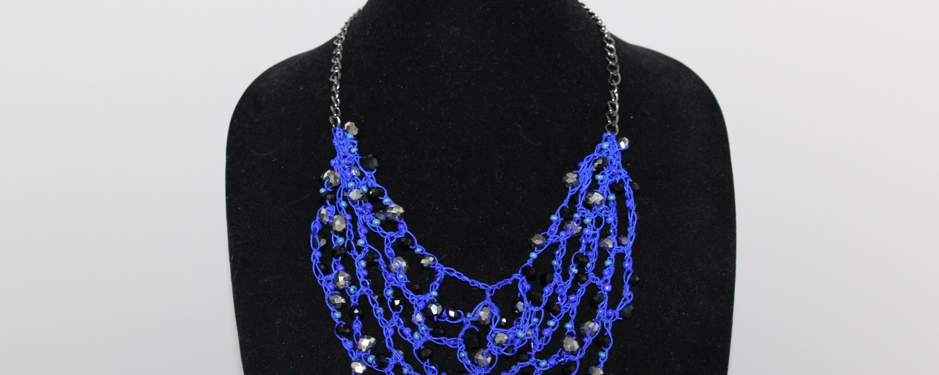 This handmade crochet bib necklace is easy to wear with its lightweight feel. Made of nylon crochet thread. The bright cobalt blue will add a pop of colour to your outfit and the assorted beads add some sparkle. This necklace is held is attached to a blackened chain and fastens at the back with a clasp.