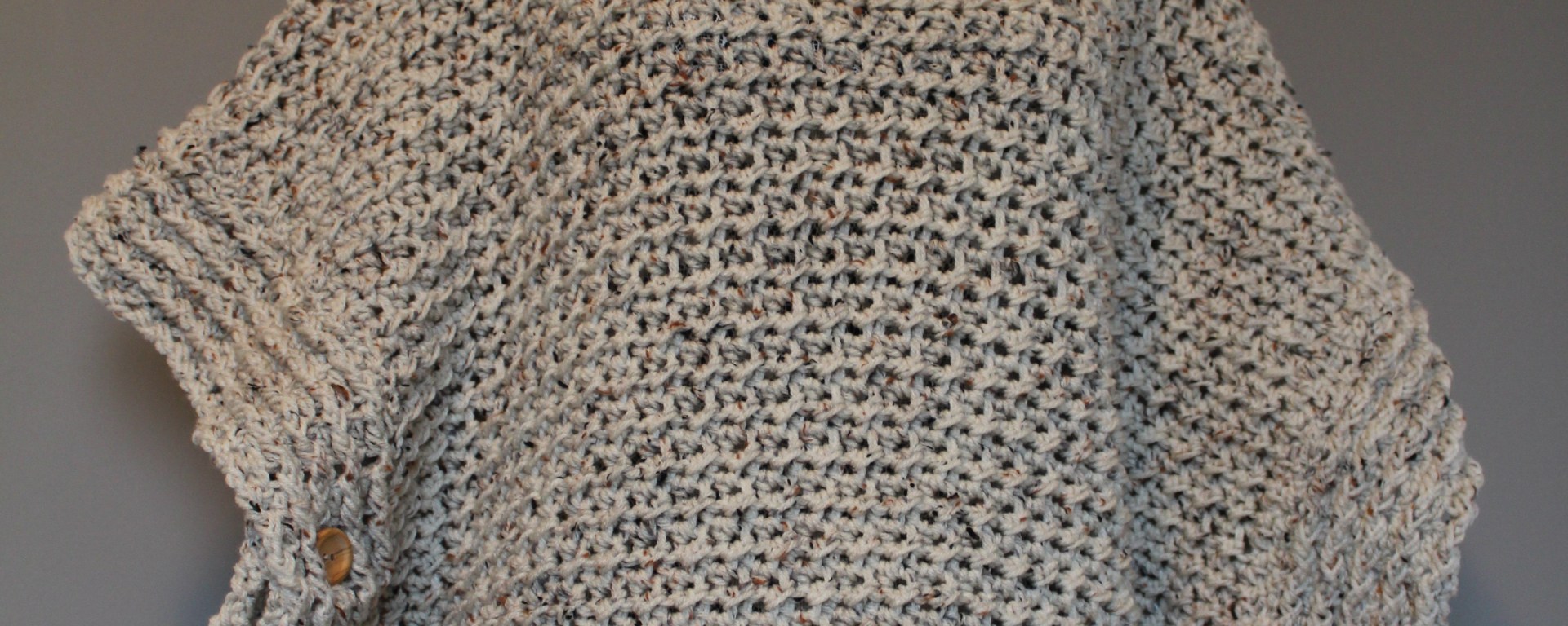 Love this oversized crochet poncho with cowl neck made with a tweed off-white yarn with flecks of black and brown and fastened on the sides with wooden buttons. It’s great for spring wear when you’re done with your winter coat and want to wear a long-sleeved shirt with some extra warmth over top! It is size medium but has an oversized fit.