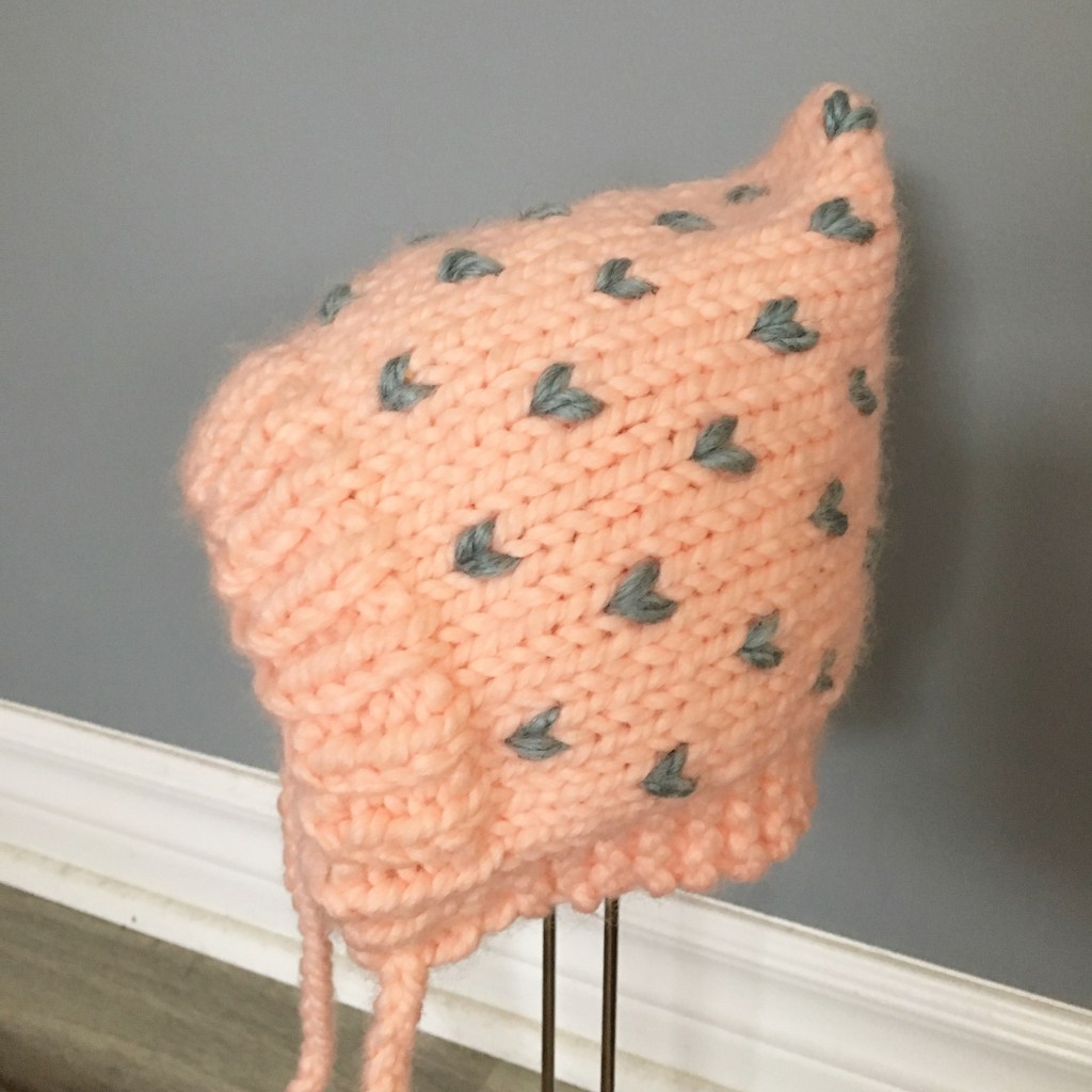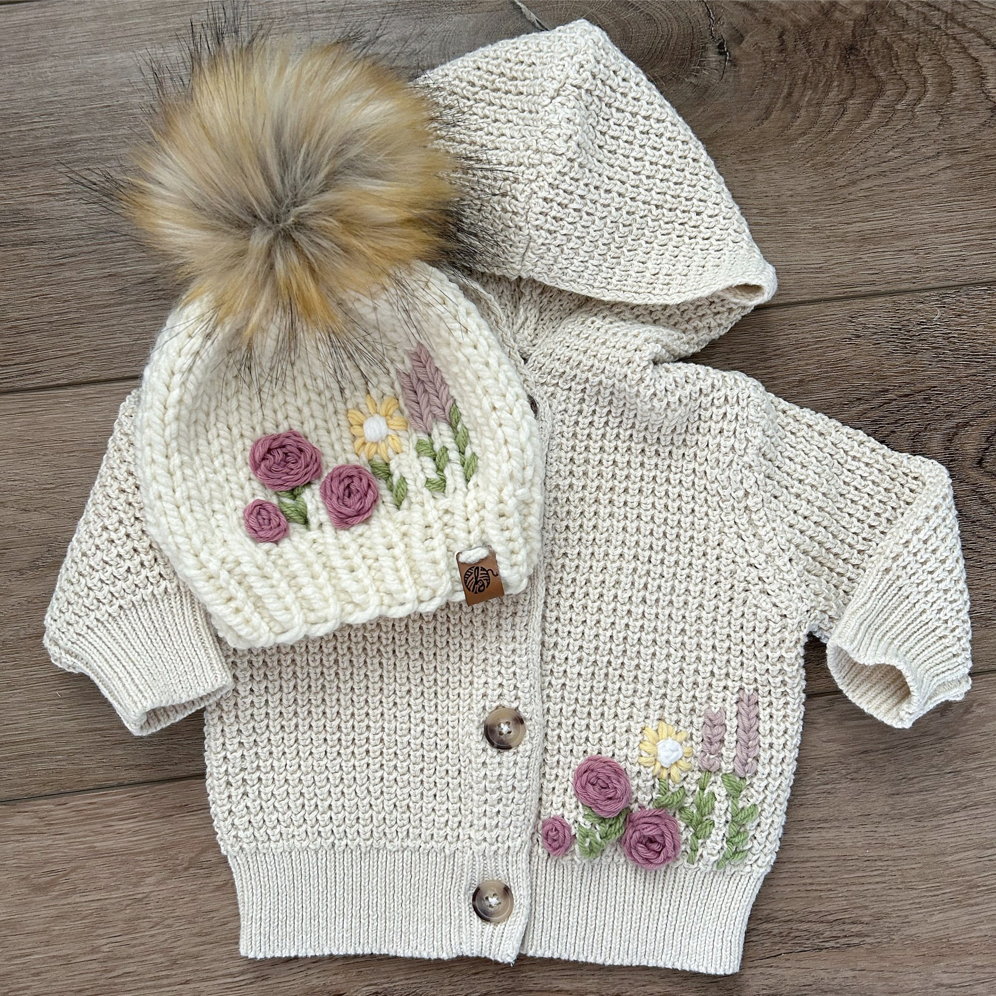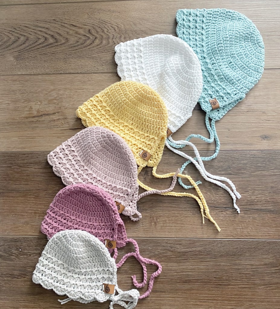 EMBROIDERED BUTTON UP SWEATER $40 | cozy knitted baby sweater with hood and buttons. Customize with hand embroidered flowers or other images. Available in limited colours and size newborn – 9 months. PAISLEY PIXIE BONNET $25 | knitted bonnet with mini hearts detail and a string tie. Made with wool blended yarn. Available in size newborn to child. Various colour combinations available. CUSTOM NEWBORN SET $75 | adorable newborn baby gift with booties, sweater and beanie. Available in assorted colours. SPRING BONNET $25 | a sweet spring bonnet with ties. Available in colours shown or custom colours upon request. Sizes range from newborn to 24 months. BABY BOOTIES $25 3-6M | crochet baby booties made with soft acrylic yarn, suede or leather bottoms & suede string tiesBABY BOOTIES $25 12-24M | crochet baby booties madewith soft acrylic yarn, suede or leather bottoms & suede string tiesSNUGGLE BUNNY $35| a soft and snuggly crochet bunny in a blanket texture yarn with plastic safety eyes. Perfect for cuddling with your baby or child. Available in assorted colours. One size.BABY SEED TOQUE $25 | knitted baby toque with texture and faux fur pom pom. Made with wool blended yarn. Available in assorted colours.BABY EMBROIDERED TOQUE $30 | knitted baby toque with faux fur pom pom. Customize with name or word or your choice. Made with wool blended yarn. Available in assorted colours.