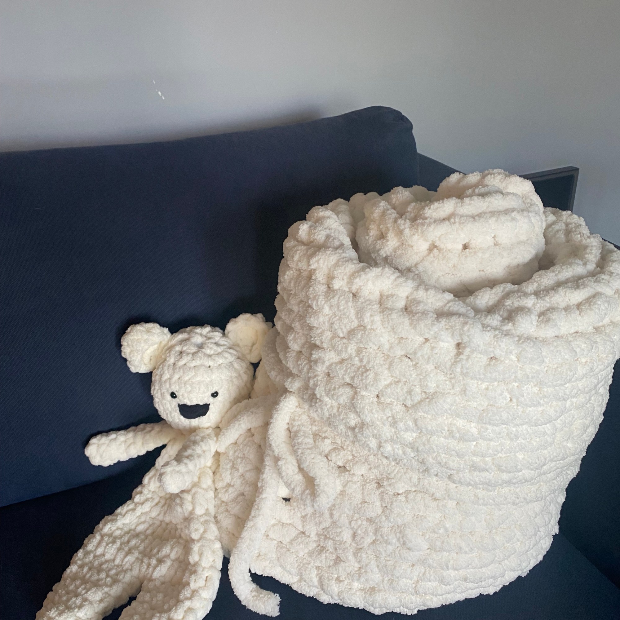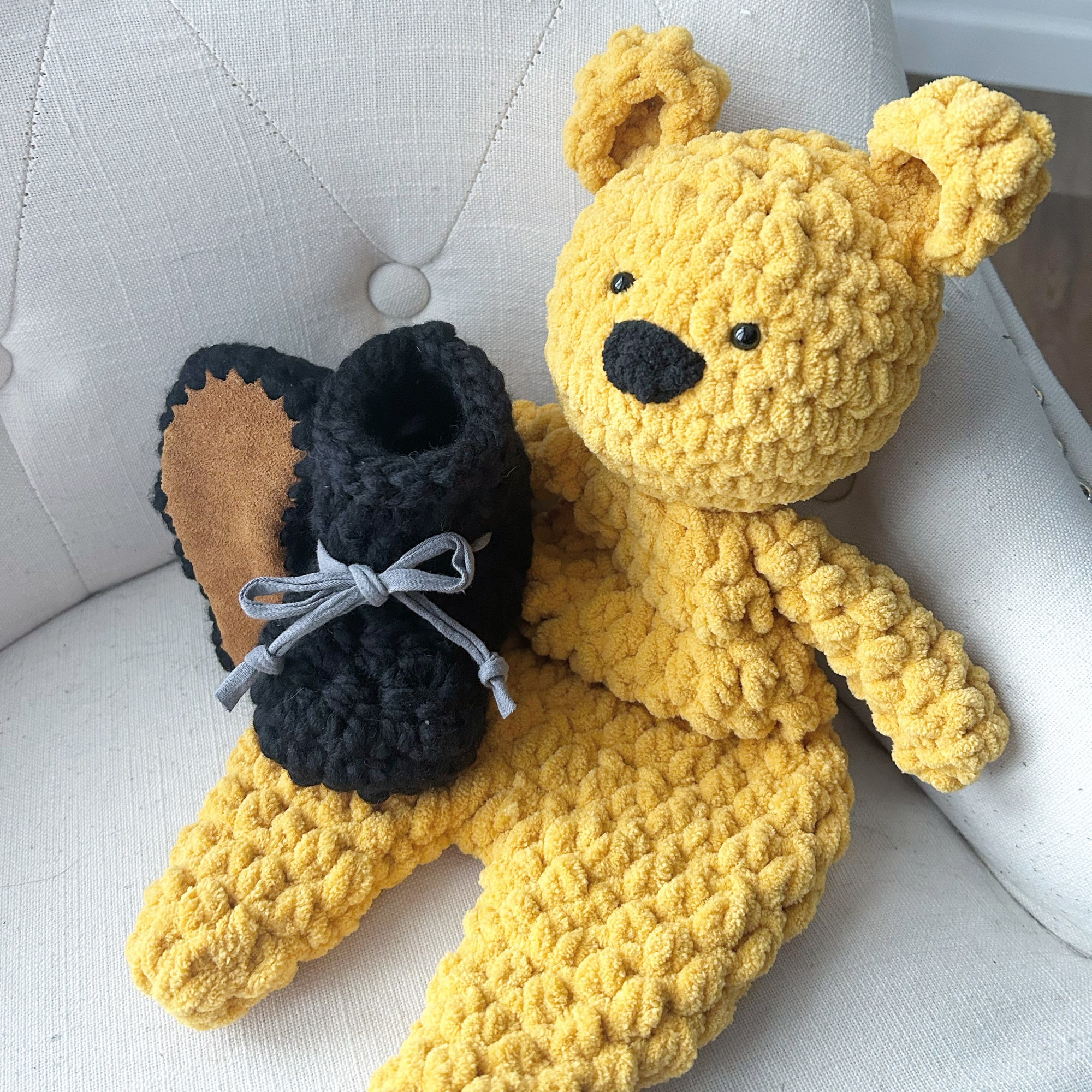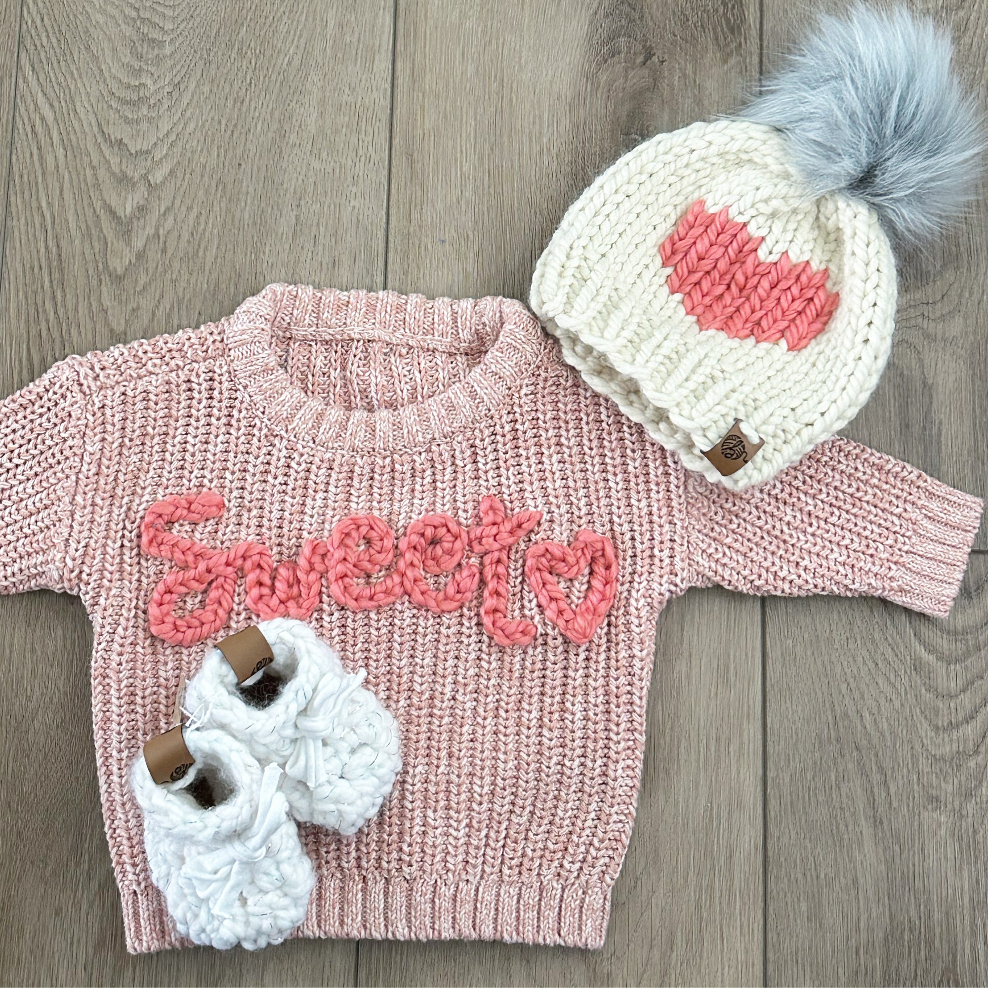 EMBROIDERED PULLOVER SWEATER $40 | a cozy knitted sweater available in assorted colours. Customize with a baby name, saying or image of your choice in hand embroidery. Sizes range from newborn – 3T. Larger sizes available on special order. The perfect baby gift!EVERLEY PIXIE BONNET $25 | a soft and lighter weight spring bonnet for your babe with a chain string tie made with stretchy acrylic yarn. Available in size newborn to child. Various colours available. BABY BEAR BEANIE NB $20 | a soft mini beanie for your tiny babe in acrylic yarn, available in blush pink, baby blue, cloud grey & whiteBOBBLE CARDI $45 | a sweet cardi for your little with bobble stitch texture, available in size NB-24M or customized larger and in your colour choice, made with acrylic yarnBABY BOOTIES $25 NB | newborn crochet baby booties made with soft acrylic yarn, suede or leather bottoms & suede string tiesBABY BOOTIES $25 6-12M | crochet baby booties made with soft acrylic yarn, suede or leather bottoms & suede string tiesSNUGGLE BEAR $35| a soft and snuggly crochet bear in a blanket texture yarn with plastic safety eyes. Perfect for cuddling with your baby or child. Available in assorted colours. One size.LOTTIE BUNNY $25 | a mini bunny made with soft yarn and plastic safety eyes, perfect for cuddling. Available in limited colours. BABY KNIT TOQUE $25 | knitted baby toque with faux fur pom pom. Made with wool blended yarn. Available in assorted colours.