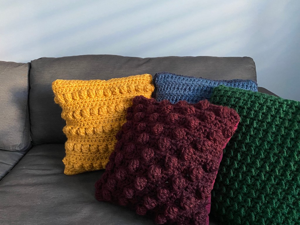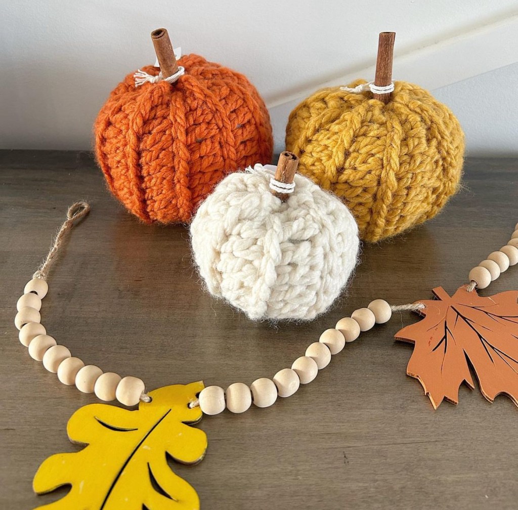 CROCHET PUMPKINS $10-$20| crochet pumpkins make a great addition to your fall decor and add some texture. Available in 3 sizes and assorted colours. Made with wool blended yarn. AUTUMN BLANKET $95| made with super soft yarn, this lapgahn is cozy and warm for those days curled up on the couch. The finger knit style makes in chunky and lightweight. Made with acrylic yarn. Available in assorted colours.PILLOW TREE $25 | crochet pillows in the shape of trees with bobble stitch texture. Made with a combination of cozy blanket yarn and wool blended yarn. Available in assorted colours.CROCHET PILLOW $35 | brighten up your couch with some colourful and textured pillows. These crochet pillows are made in a variety of styles and colours. Made with wool blended yarn sewn onto fabric and includes pillow insert.